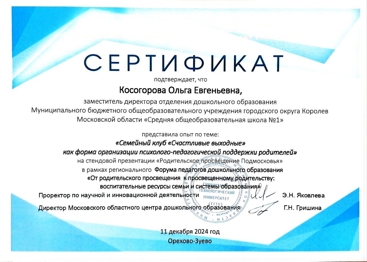 – Сертификат о представлении опыта работы по теме “Применение технологии “Клубный час” в реализации проекта Предшкола: современный детский сад” в рамках областного марафона педагогических достижений (Косогорова О.Е.)